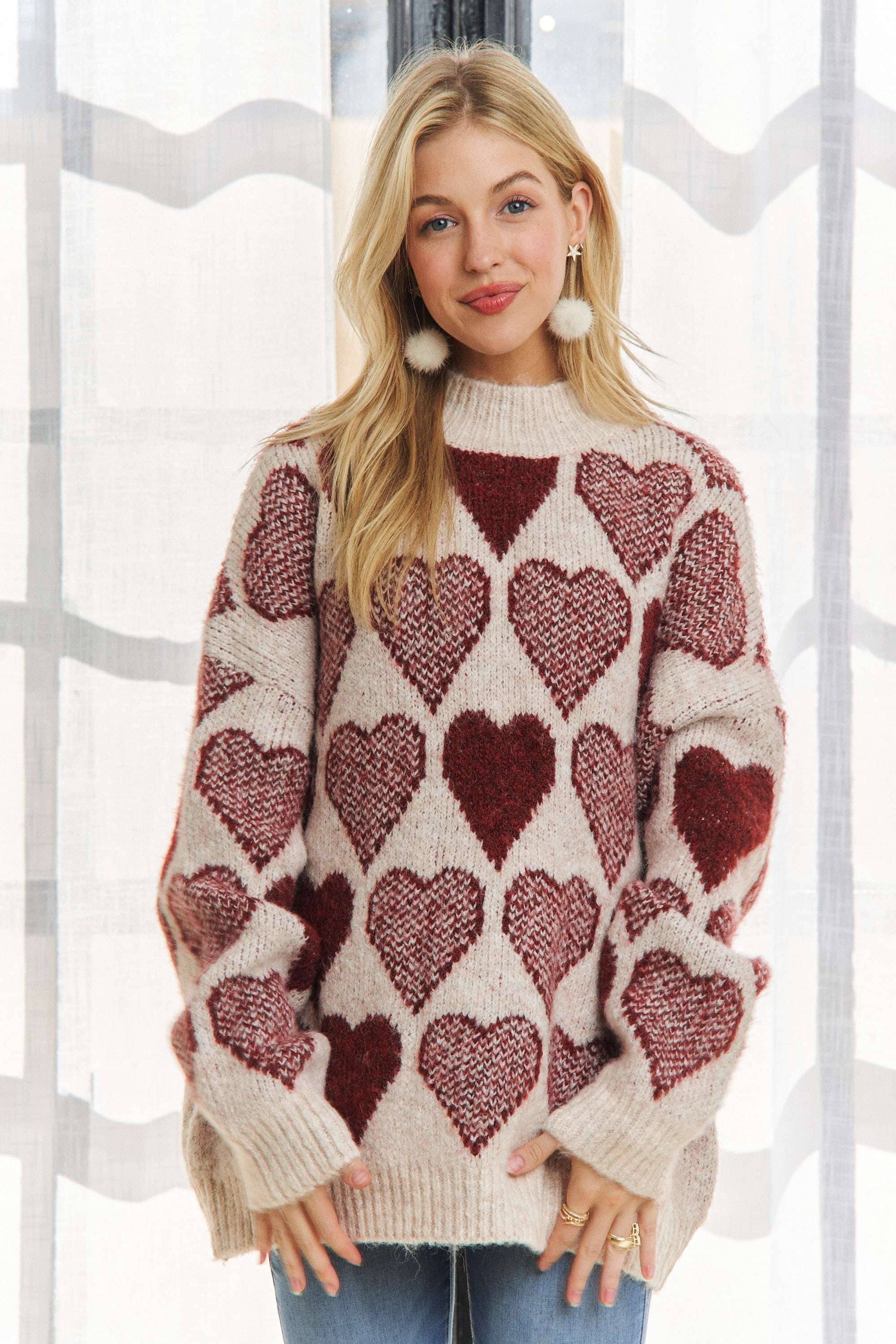 LOOSE FIT MOCK NECK HEART PRINTED PULLOVER SWEATER